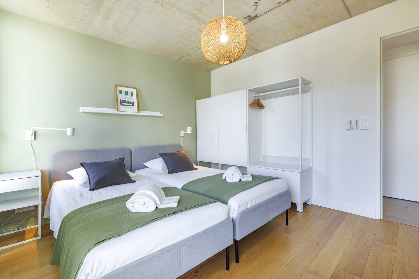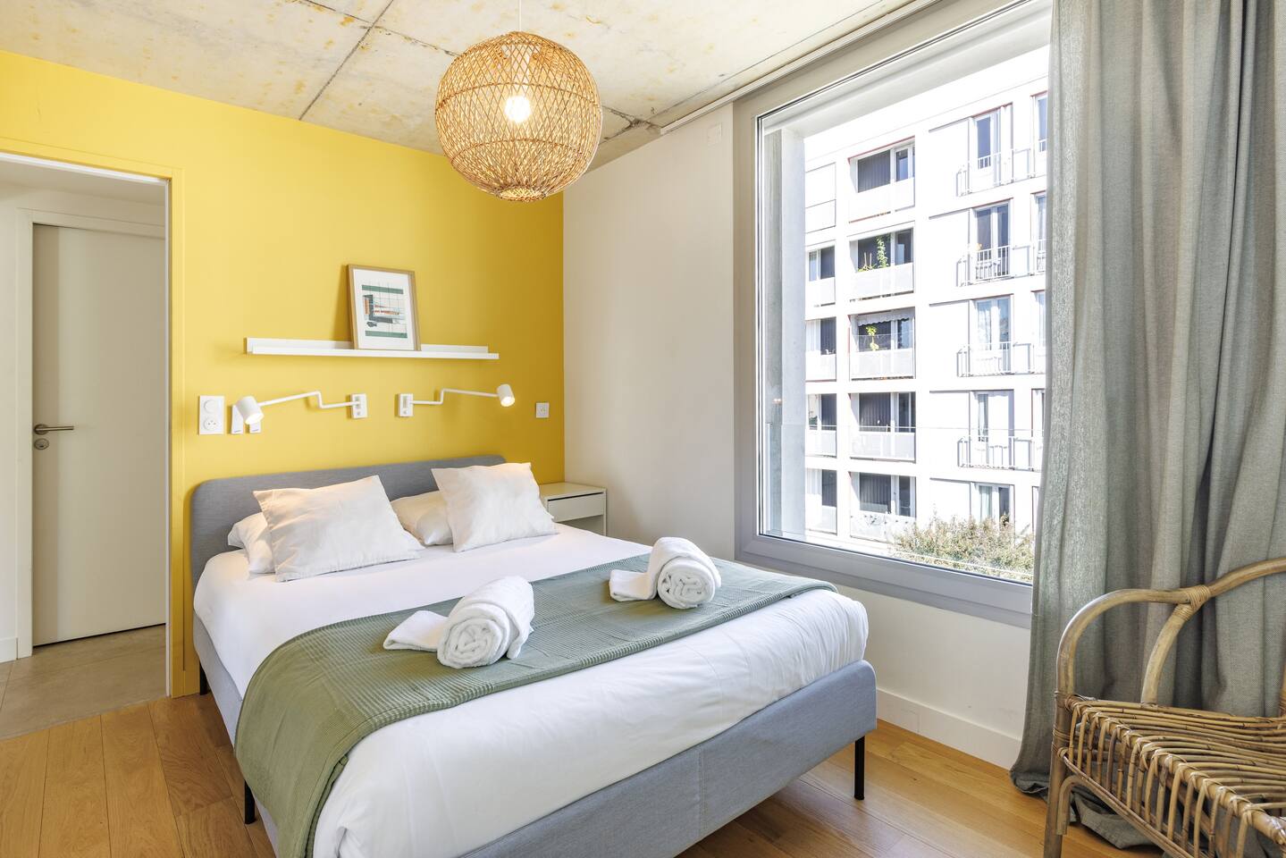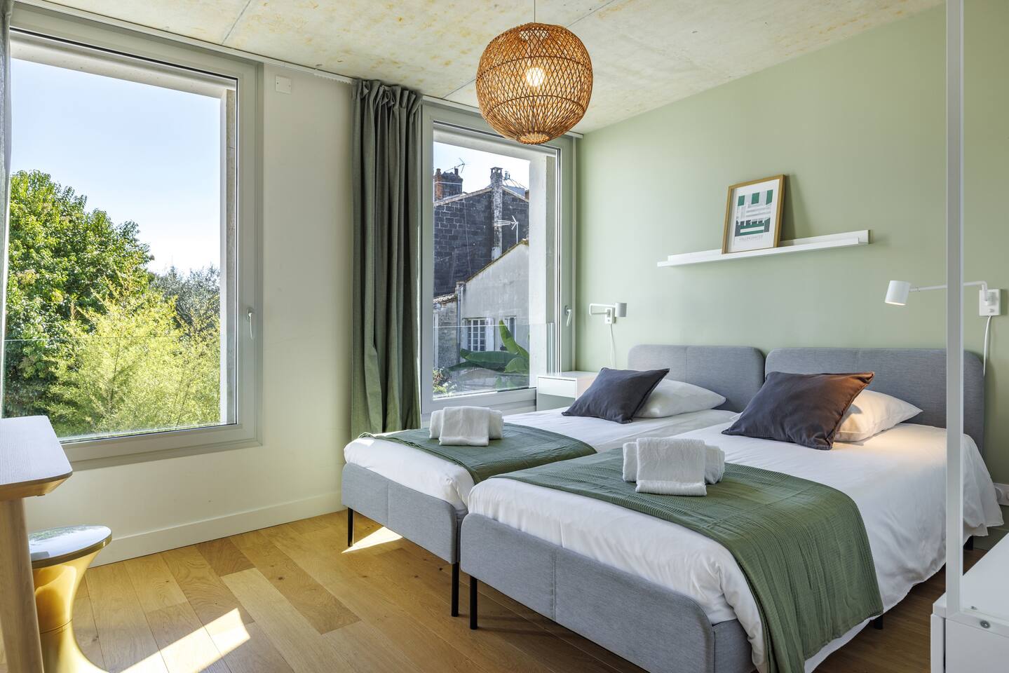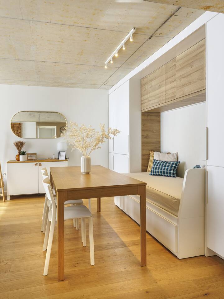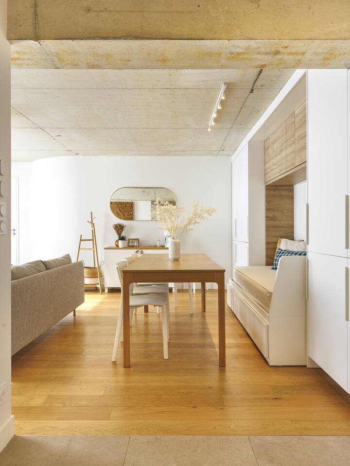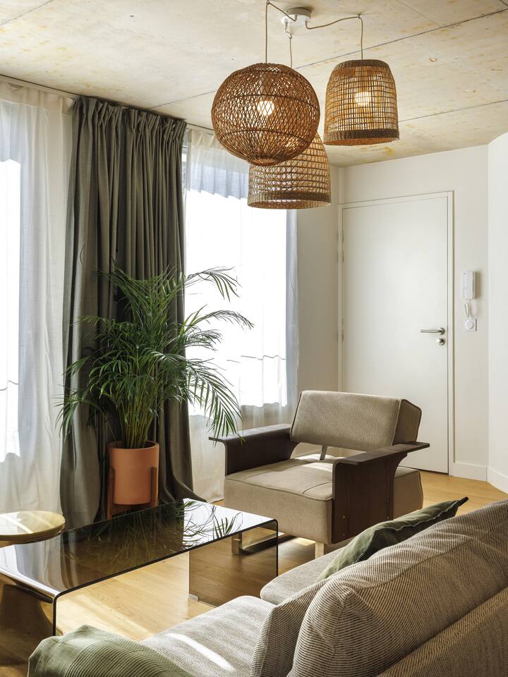 This 62 m² apartment accommodates up to 6 people. • Bedroom 1: 2 single beds, can be joined on request into a king-size bed. • Bedroom 2: 1 double bed. • Living room: Convertible bench for 2 (extra sleeping). Hotel-quality linens provided. • Open kitchen: induction hob, oven, fridge-freezer, dishwasher, microwave, Nespresso, toaster, kettle, wine glasses + basic condiments. • Bright living area: sofa, smart TV, fiber Wi-Fi, desk space (remote work OK). • Bathroom: walk-in shower, hairdryer. Separate WC. Laundry: washing machine, iron and ironing board. • Summer comfort: building cooled by geothermal active slabs (24–26 °C generally) + fans available. Non-smoking apartment. Professional cleaning between each stay.