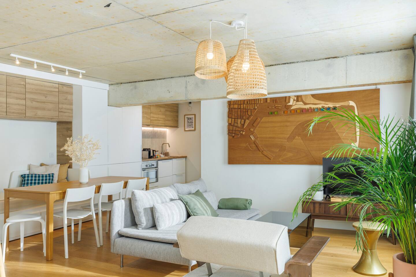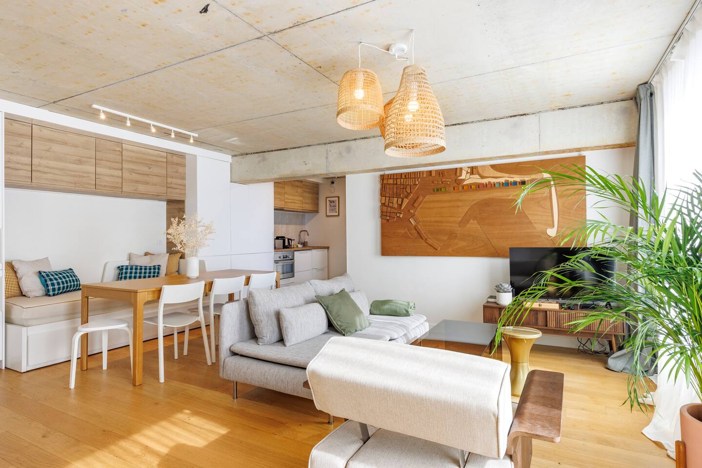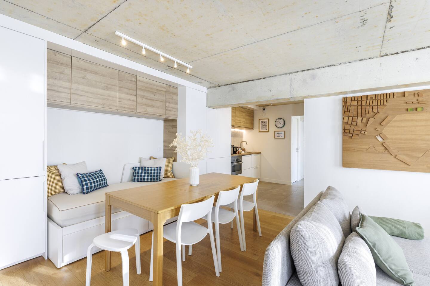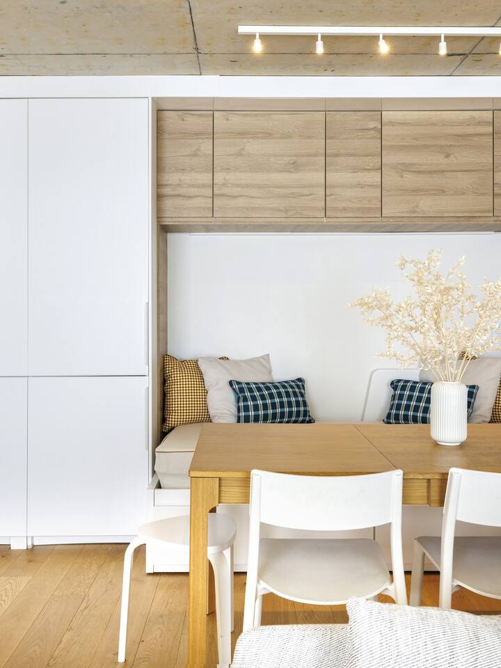 This 62 m² apartment accommodates up to 6 people. • Bedroom 1: 2 single beds, can be joined on request into a king-size bed. • Bedroom 2: 1 double bed. • Living room: Convertible bench for 2 (extra sleeping). Hotel-quality linens provided. • Open kitchen: induction hob, oven, fridge-freezer, dishwasher, microwave, Nespresso, toaster, kettle, wine glasses + basic condiments. • Bright living area: sofa, smart TV, fiber Wi-Fi, desk space (remote work OK). • Bathroom: walk-in shower, hairdryer. Separate WC. Laundry: washing machine, iron and ironing board. • Summer comfort: building cooled by geothermal active slabs (24–26 °C generally) + fans available. Non-smoking apartment. Professional cleaning between each stay.