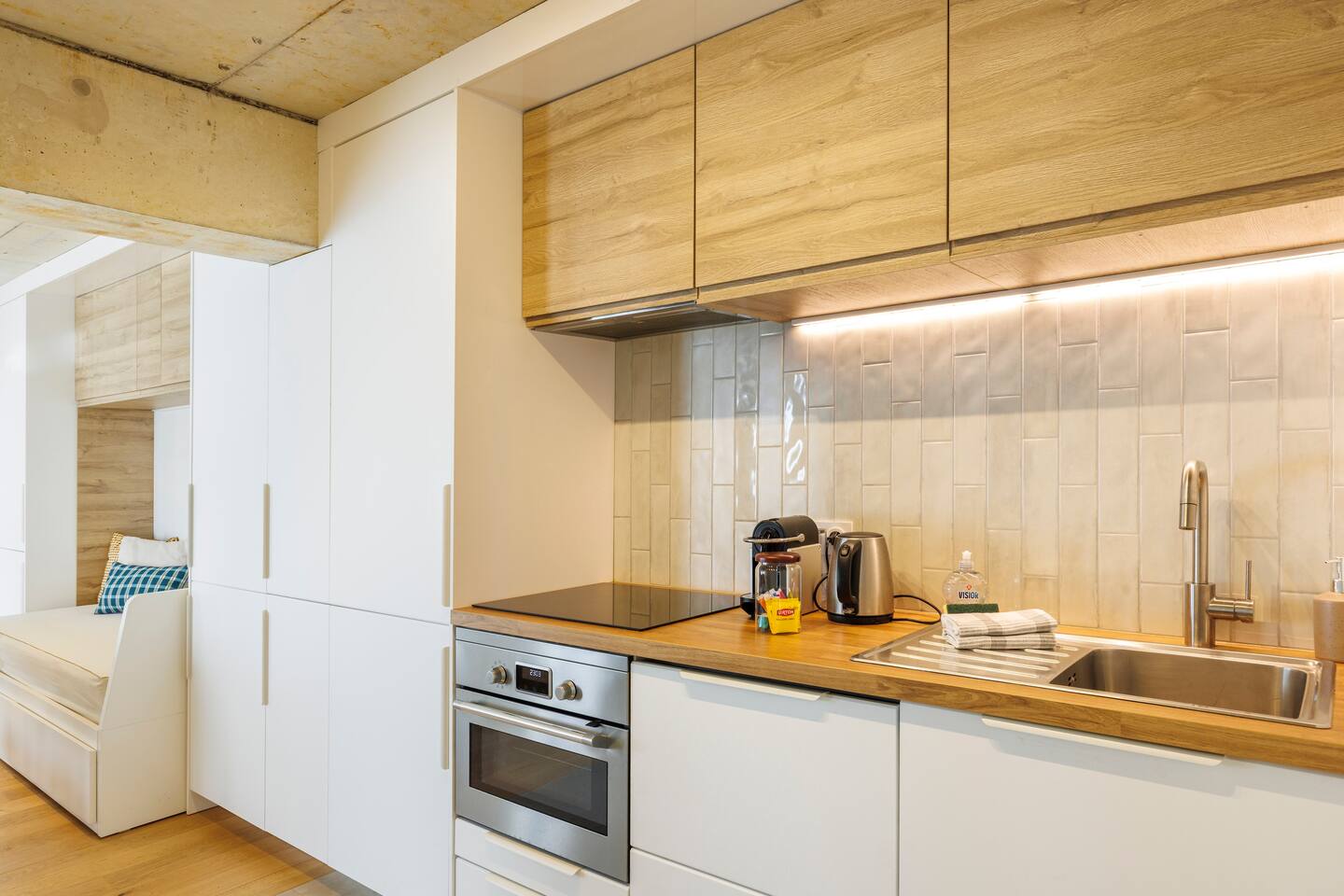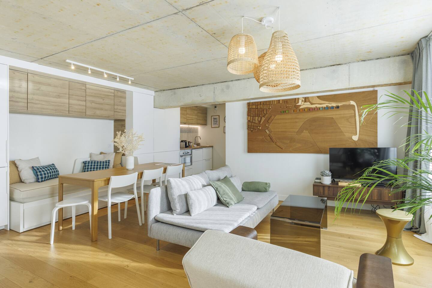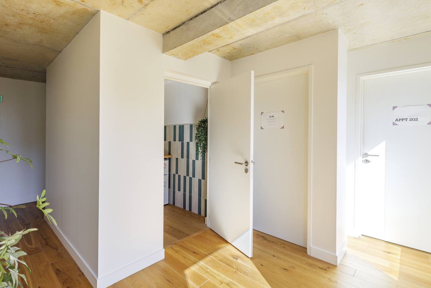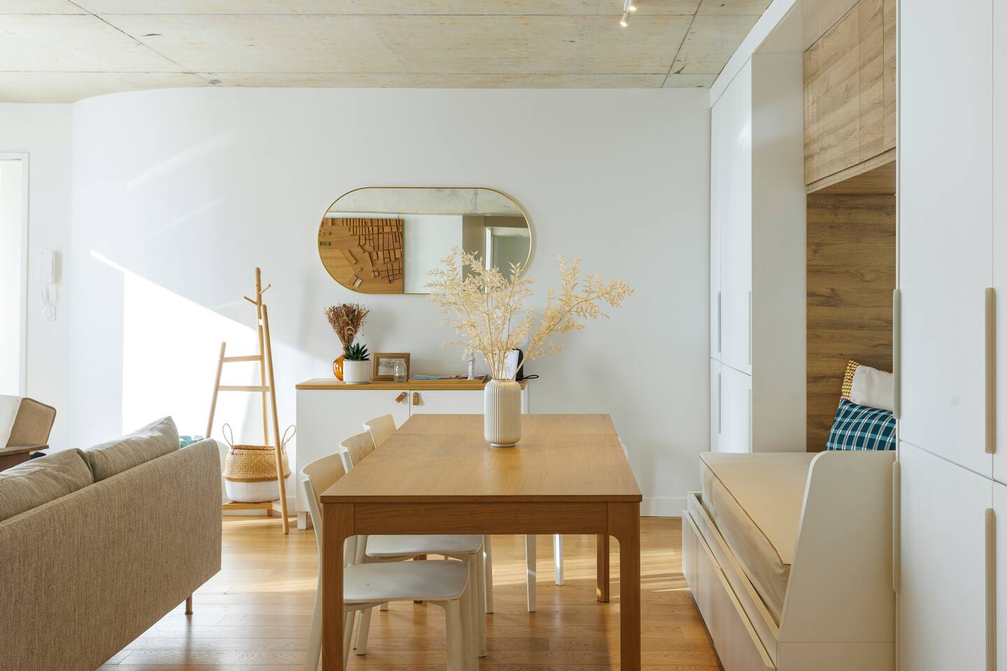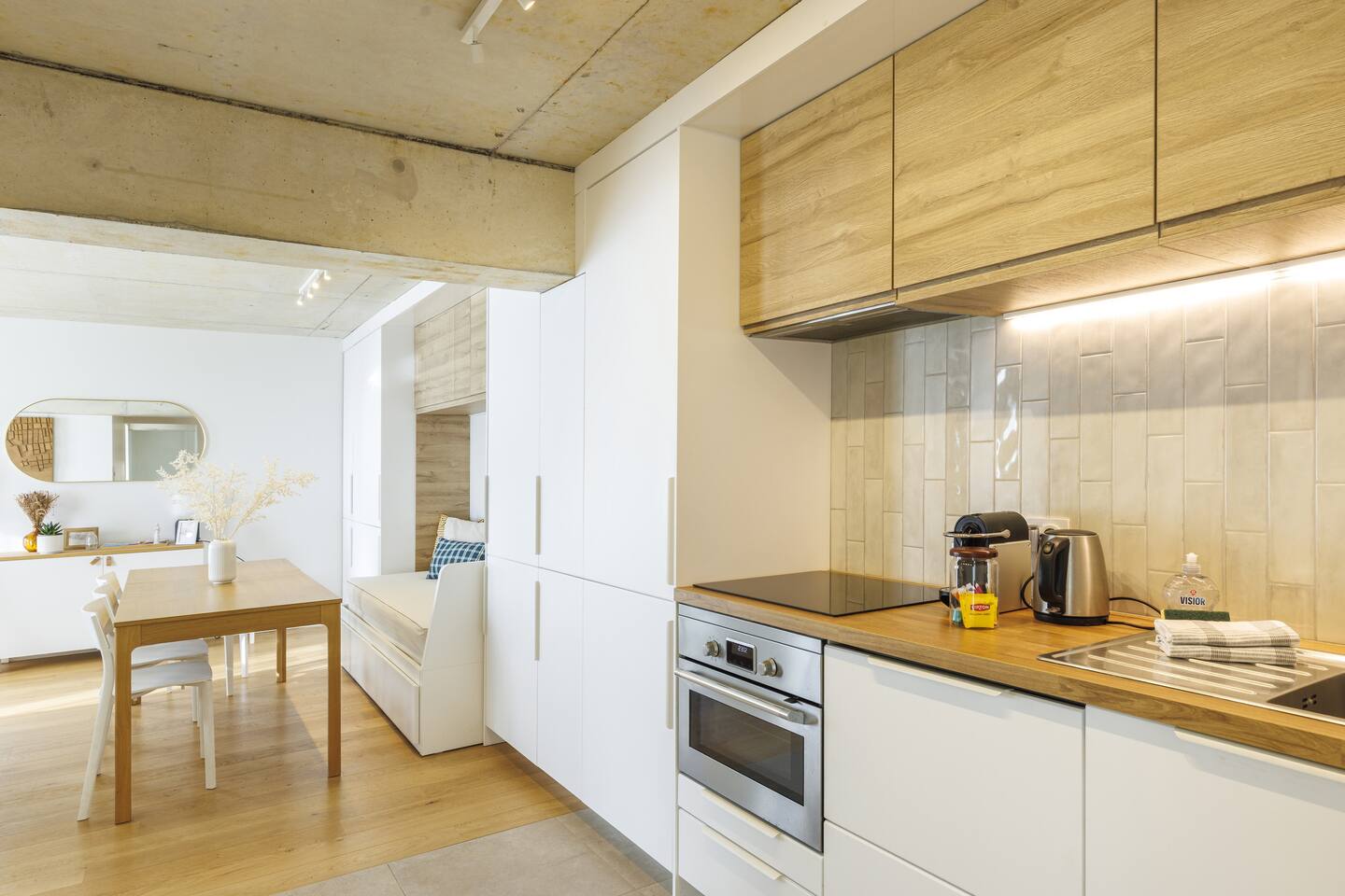 This 62 m² apartment accommodates up to 6 people. • Bedroom 1: 2 single beds, can be joined on request into a king-size bed. • Bedroom 2: 1 double bed. • Living room: Convertible bench for 2 (extra sleeping). Hotel-quality linens provided. • Open kitchen: induction hob, oven, fridge-freezer, dishwasher, microwave, Nespresso, toaster, kettle, wine glasses + basic condiments. • Bright living area: sofa, smart TV, fiber Wi-Fi, desk space (remote work OK). • Bathroom: walk-in shower, hairdryer. Separate WC. Laundry: washing machine, iron and ironing board. • Summer comfort: building cooled by geothermal active slabs (24–26 °C generally) + fans available. Non-smoking apartment. Professional cleaning between each stay.