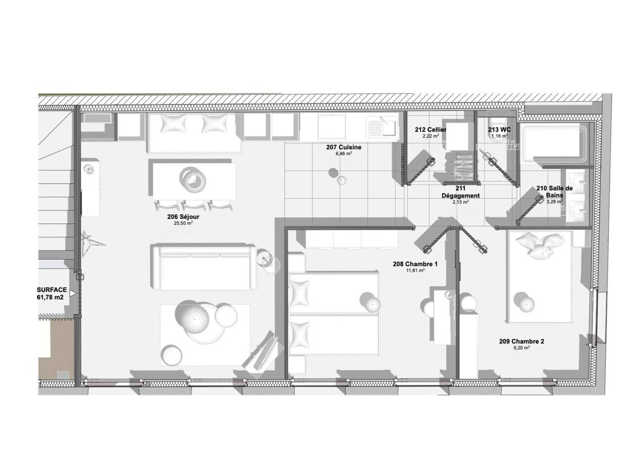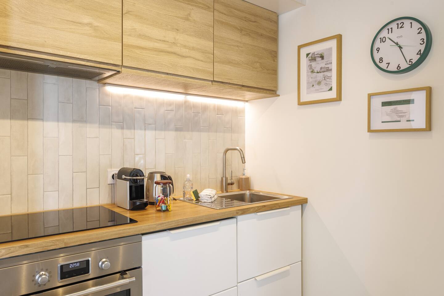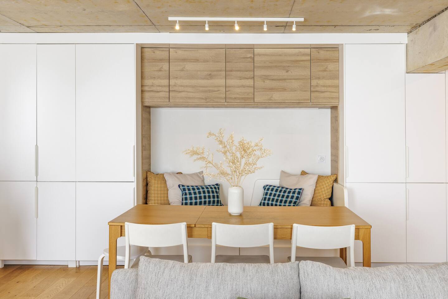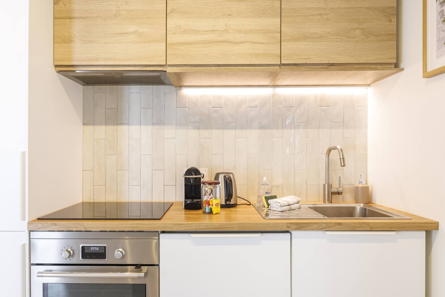 This 62 m² apartment accommodates up to 6 people. • Bedroom 1: 2 single beds, can be joined on request into a king-size bed. • Bedroom 2: 1 double bed. • Living room: Convertible bench for 2 (extra sleeping). Hotel-quality linens provided. • Open kitchen: induction hob, oven, fridge-freezer, dishwasher, microwave, Nespresso, toaster, kettle, wine glasses + basic condiments. • Bright living area: sofa, smart TV, fiber Wi-Fi, desk space (remote work OK). • Bathroom: walk-in shower, hairdryer. Separate WC. Laundry: washing machine, iron and ironing board. • Summer comfort: building cooled by geothermal active slabs (24–26 °C generally) + fans available. Non-smoking apartment. Professional cleaning between each stay.