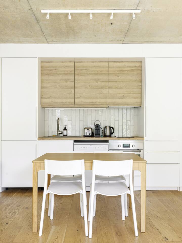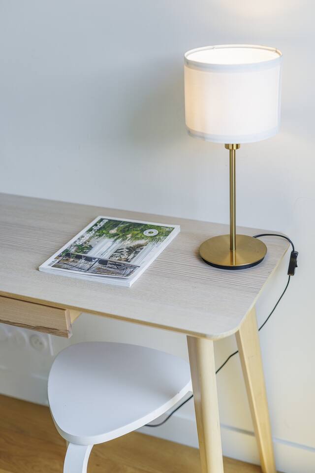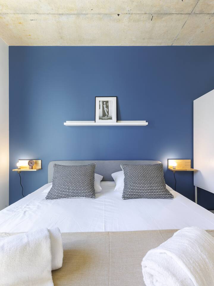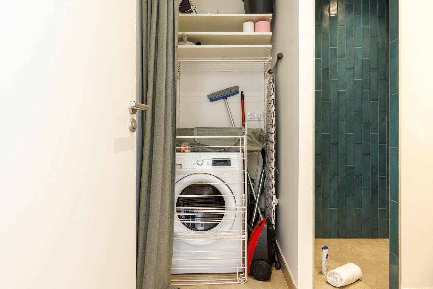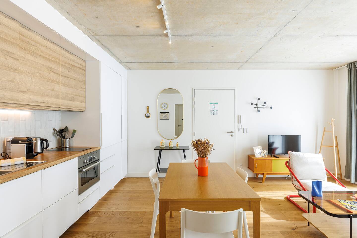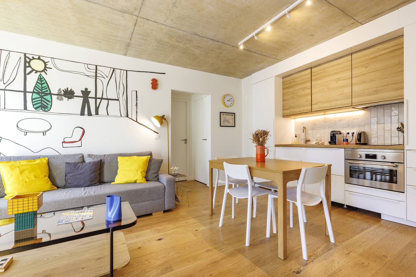 This 40 m² apartment accommodates up to 4 guests. • Bedroom: 1 double bed. • Living room: 2-seater sofa bed (extra sleeping). Hotel-quality linens provided. • Open kitchen: induction hob, oven, fridge-freezer, dishwasher, microwave, Nespresso, toaster, kettle, wine glasses + basic condiments. • Bright living area: sofa, smart TV, fiber Wi-Fi, desk space (remote work OK). • Bathroom: walk-in shower, hairdryer. Separate WC. Laundry: washing machine, iron and ironing board. • Summer comfort: building cooled by geothermal active slabs (24–26 °C generally) + fans available. Non-smoking apartment. Professional cleaning between each stay.